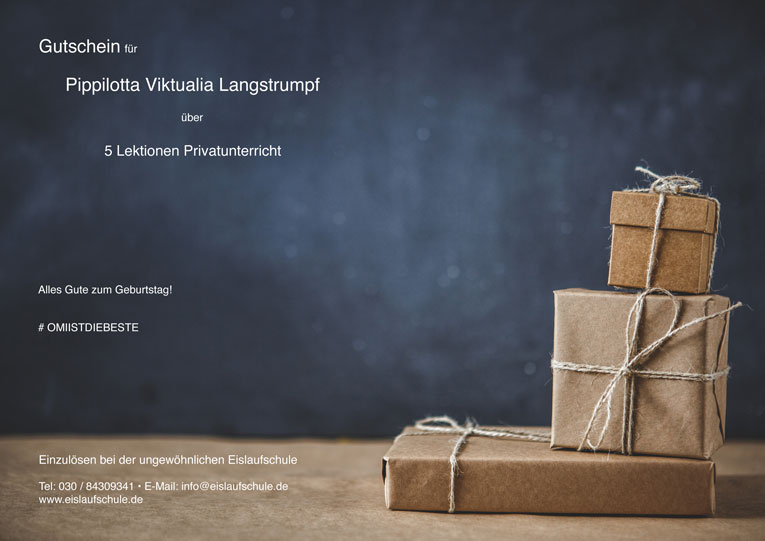 So geht's: Suchen Sie aus unserem Privatunterricht-Angebot heraus, was Sie verschenken möchten. Zum Beispiel eine einzelne Lektion oder einen 5-er Block für zwei Personen. Entscheiden Sie sich für eines der Gutschein-Motive - Pinguin, Eis am Stiel, Päckchen, Weihnachtskugeln oder Eisläuferin. Schreiben Sie uns über das Kontaktformular folgende Informationen: